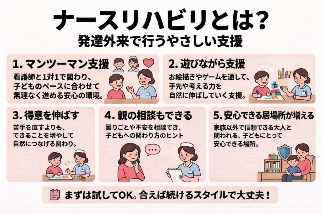 この記事では、ナースリハビリで実際にどんなことをしているのか、そして親として感じたことをリアルにお伝えします。